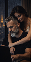 Za chrbtom zacítim pohyb. Tichý, mäkký, ako keď sa mačka dotkne závesu. Potom ruky. Objímu ma zozadu a jemne ma pritlačia k operadlu stoličky. Teplý dych na krku. Bozk, ktorý nie je ani nevinný, ani otvorene vyzývavý. Len presný. Cítim jej vôňu – jemný parfum s tónmi jazmínu a niečo kovové pod tým, možno strach, možno odvaha.